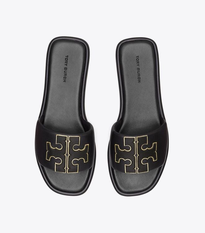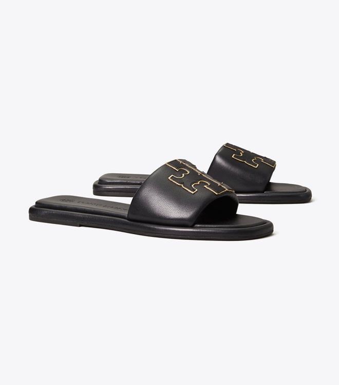 Mẫu dép Tory Bruch quai ngang mang đến sự sang trọng. Được làm bằng da có đệm mềm ôm sát chân, với đế xốp có đệm để hỗ trợ linh hoạt . Double T nhô cao được viền bằng kim loại để tạo độ baos và tính tế cho giày. Mặt trên bằng da napa có đệm