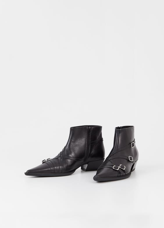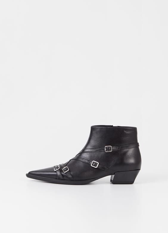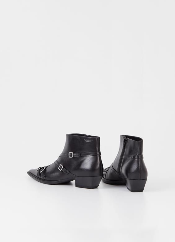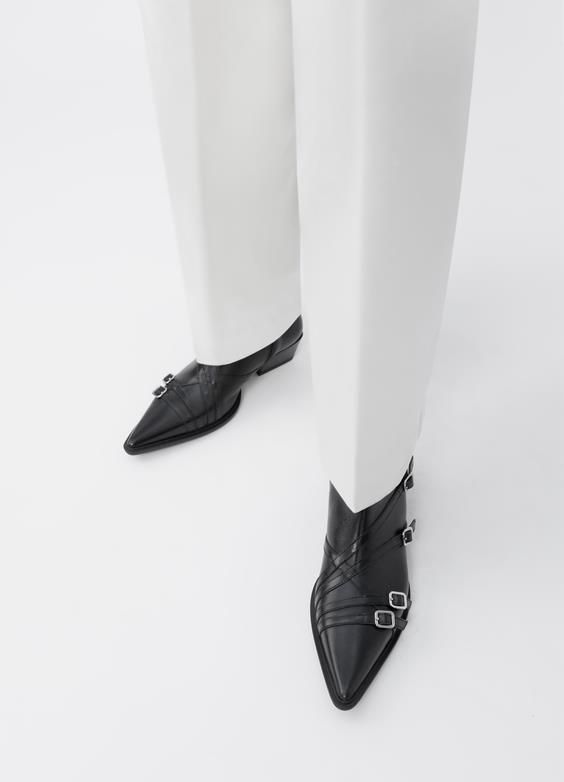 Cassie là đôi boot cổ ngắn nổi bật, được chế tác từ da đen với những chiếc khóa trang trí, mũi giày nhọn sắc sảo và khóa kéo bên. Gót giày kiểu Cuban với chiều cao 40mm mang lại sự thoải mái và phong cách.